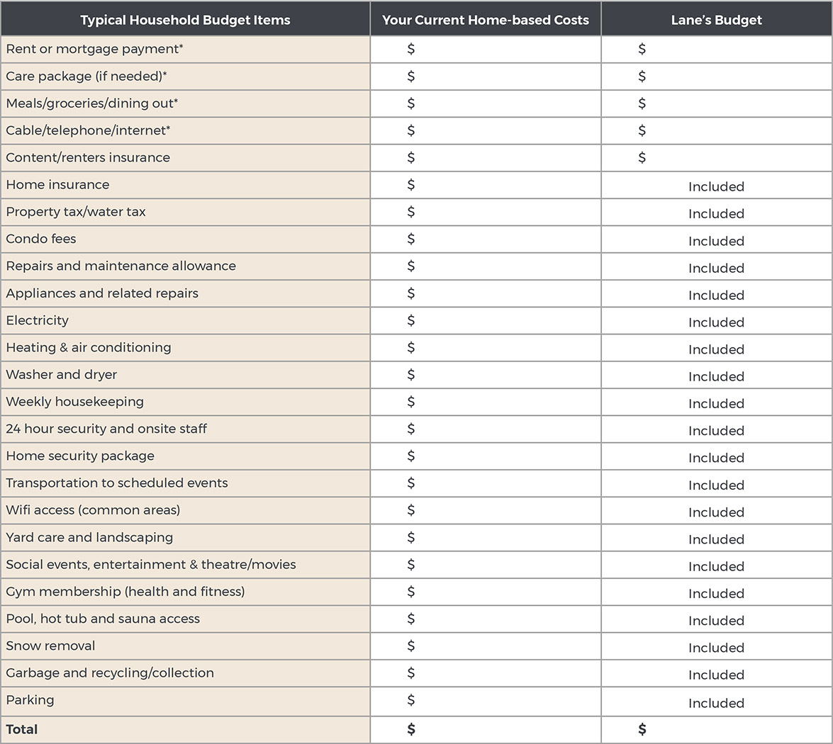 Here’s an easy-to-use budget worksheet to help you understand and calculate the real cost of managing your own home. When you add together all of the bills and expenses that dip into your monthly budget, you may find that a more carefree lifestyle at Lanes is closer than you think.