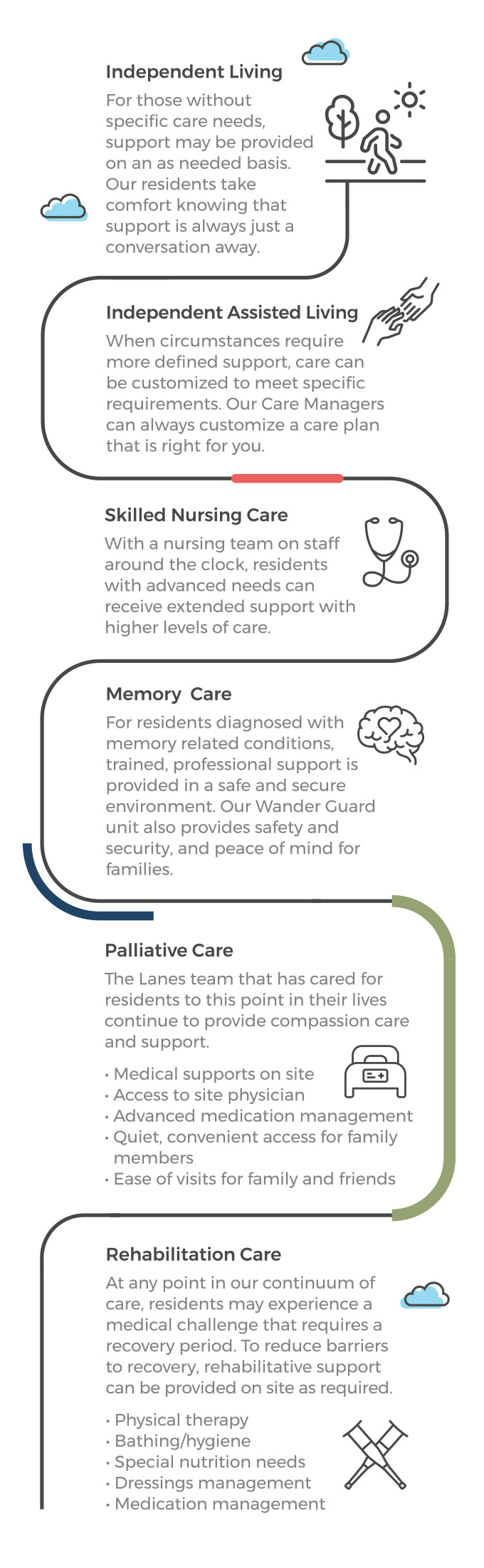 Lane’s continuum of care ensures that your Lane’s home can be your forever home, with familiar surroundings, friendly neighbors and caring, professional support throughout any health challenge. We work with new residents to determine appropriate supports from day one, and should circumstances change in the future, we ensure that the supports and the levels of care are adapted to address the evolving need.
